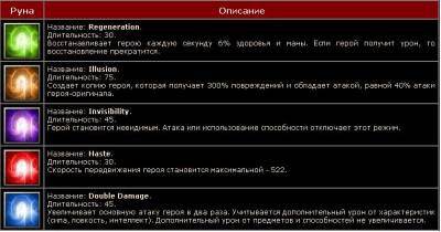 Руна - специальный предмет, появляющийся на карте и дающий подобравшему его герою временный бонус. Каждые 120 секунд происходит появление случайной руны на одном из двух возможных респаунов. Если руна в течение 115 секунд не будет подобрана, то она не исчезнет, и новая руна не появится. Существует возможности активирования нескольких рун одновременно: 1) Поместить руну в Empty Bottle, где она может храниться 120 секунд. Дождаться появления следующей, подобрать её и активировать руну в Empty Bottle. 2) Подобрать руну в течение 115 секунд после респауна, и пока не вышло её действие, взять следующую появившуюся руну.